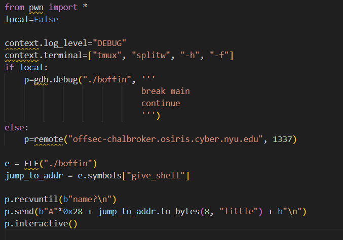 We can overwrite all these values by sending 40 (0x28) "A"s into gets. Now that we have reached the return address, we can overwrite the current return address with the address of give_shell, which gives us the shell. Thus, this challenge is solved.