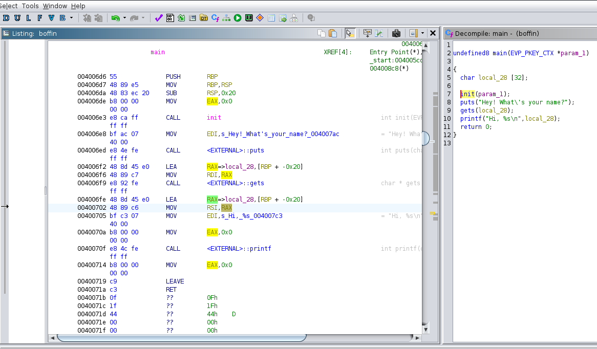 If we examine main, we can see that a string of 32 bytes is allocated space on the stack. We also know that there is a saved RBP 8 bytes long before this allocated space.