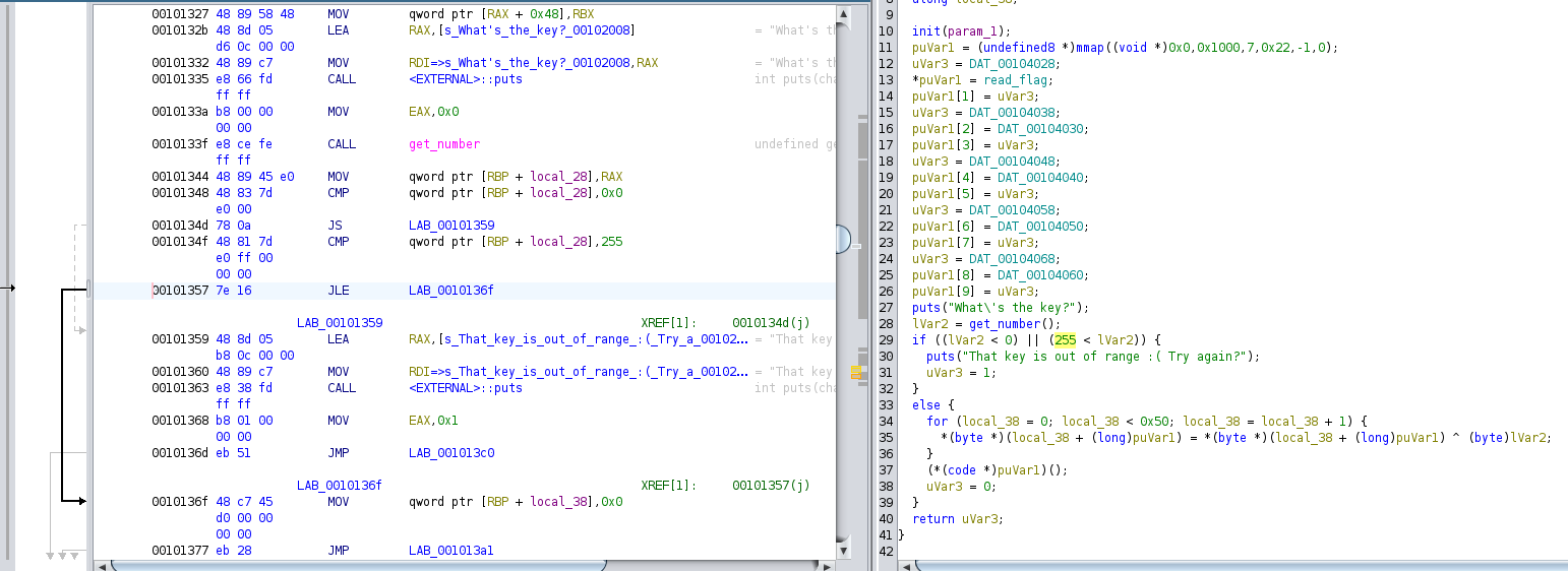 Binary, script for exploitation, and PDF of solutionI completed this challenge using brute force. If we look at the decompiler, we can see that the entered key needs to be between 0 and 255 (inclusive). So, we could just brute force all numbers from 0 to 255 to get the key. Please see the python solver script.