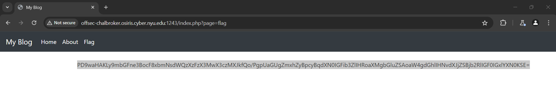 Include supports PHP stream filter URLs. Thus, we can change “page=flag” to “page=php://filter/convert.base64-encode/resource=flag” to get a base64 encoding of the flag.