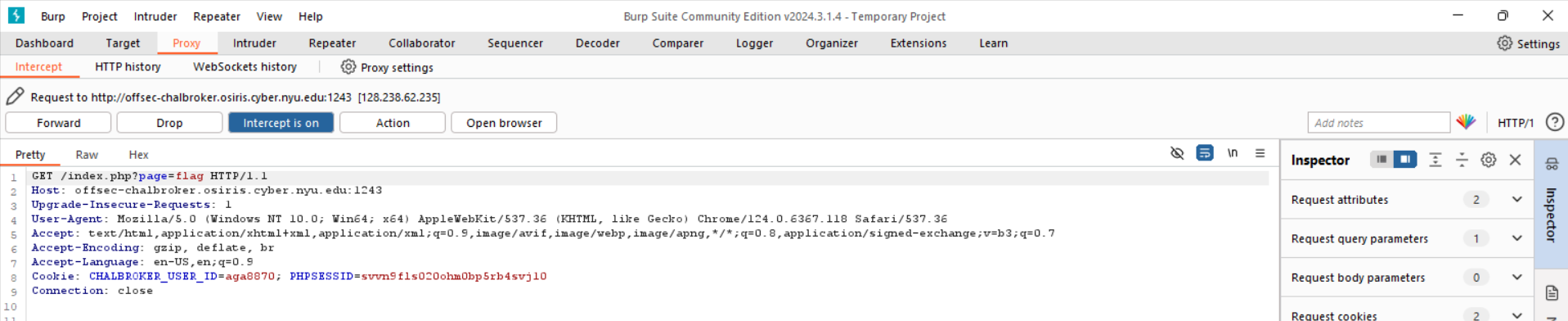Thus, we can conclude that we need to leak some source code. Furthermore, from the name of this challenge, we can conclude that the source code contains a PHP file inclusion vulnerability. When looking at burp suite, we can also see that there is a “page=flag”.