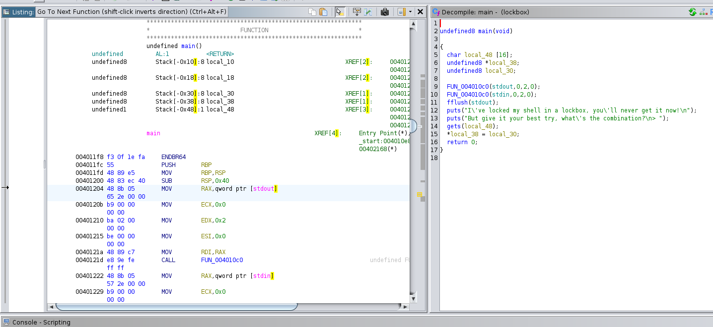 If we examine the assembly, we can see that 0x40 bytes of space is allocated to the stack. We also know that there is a saved RBP 8 bytes long before this allocated space. So, we know that we must overwrite 0x48 bytes to get to the return address.