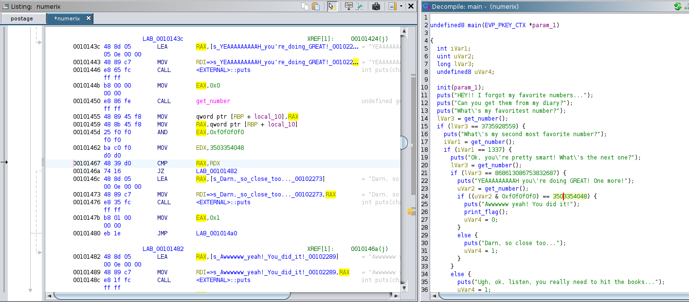 binary and writeupTo complete this challenge, I analyzed the binary. I managed to figure out that this program is one that asks the user what the programmer's favourite numbers are. Then, the program gives the user feedback based on whether they are right. The programmer's favourite numbers are hardcoded into the program, so I used Ghidra to translate the hex into decimal and found the programmer's favourite numbers. For the last question, the favourite number needed to be a number such that number_guessed & B == C, where B and C were given. Clearly, number_guessed could just be set to C, and then if this statement could ever work, it would work. This is how I found all the answers for this challenge.