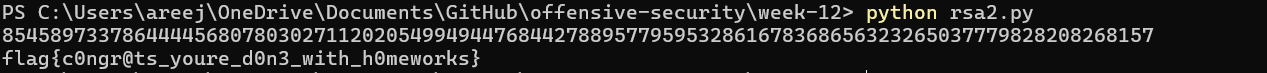 Now, we have u and v. Thus, we just need to plug them into the equation m = ((c1^u mod n)*(c2^v mod n)) mod n to get back m. After that, we can convert the integer m back to ascii and get the flag. These are the results when I run my python script: